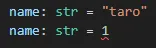 name: str = 1 # strを想定しているがintが入っている。エラーにはならない