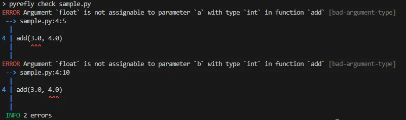 上の例ではaddに2つのintの引数を渡しているため、正しく呼び出せています。このときはvscode上で特にエラーは検出されておらず、コマンドライン上でpyrefly check コマンドを実行してもエラーは確認されません。