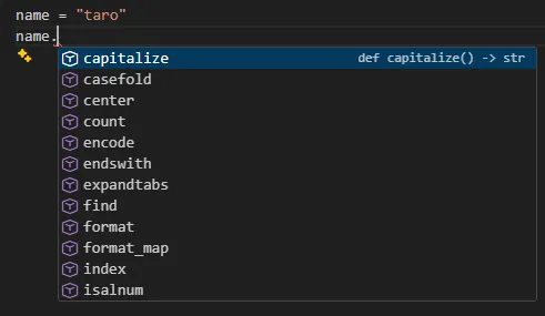 もう一つの特徴として紹介して型推論についても確認してみましょう。発表で実際に使用されていた例を書いてみます。はじめにPyreflyの機能をoffにしてpylanceを有効化してみます。例えば、以下のように。str型の変数が入っているnameの後に、ドットを入力するとstr型が持つ、次に入力されうる候補を挙げてくれます。