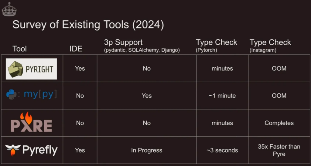 このような型チェッカーにMeta社が開発したPyreflyが登場しました。読み方は”パイアフライ”です。ホタルをイメージしているようで、firefly ”ファイアフライ”と同じです。こちらはRust製で作成された型チェッカーです。Python関連のRust製ツールはuvが有名だと思います。こちらは仮想環境の管理を行うツールですが、その特徴はなんといっても動作の早さです。同じRust製であるPyreflyもそのような特徴を引き継いでいます。