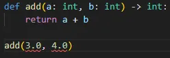 渡す引数を3.0, 4.0にしてみます。float型を渡していることになりますが、関数としては正しく動作をして7.0を返します。ただし、vscode上ではエラーを示す赤い波線が表示され ます。