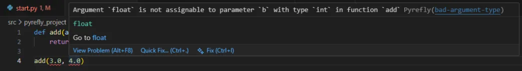 カーソルをあてると指摘されている内容が確認できます。これは4.0にあてている画面ですが、引数’b’にはintが入るはずなのにfloatが入っていると指摘されていますね。